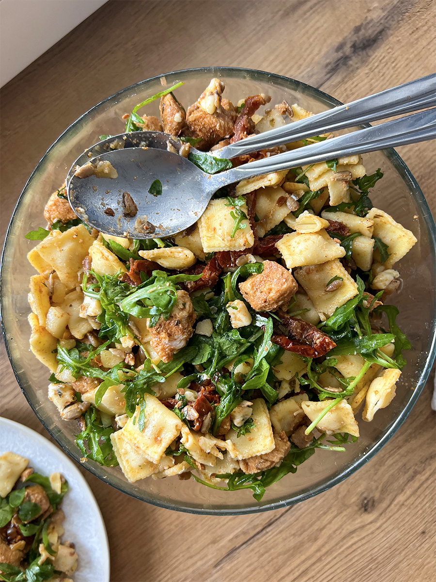 - Ravioli gotuję zgodnie z instrukcją podaną na opakowaniu, odcedzam i pozostawiam do ostygnięcia.